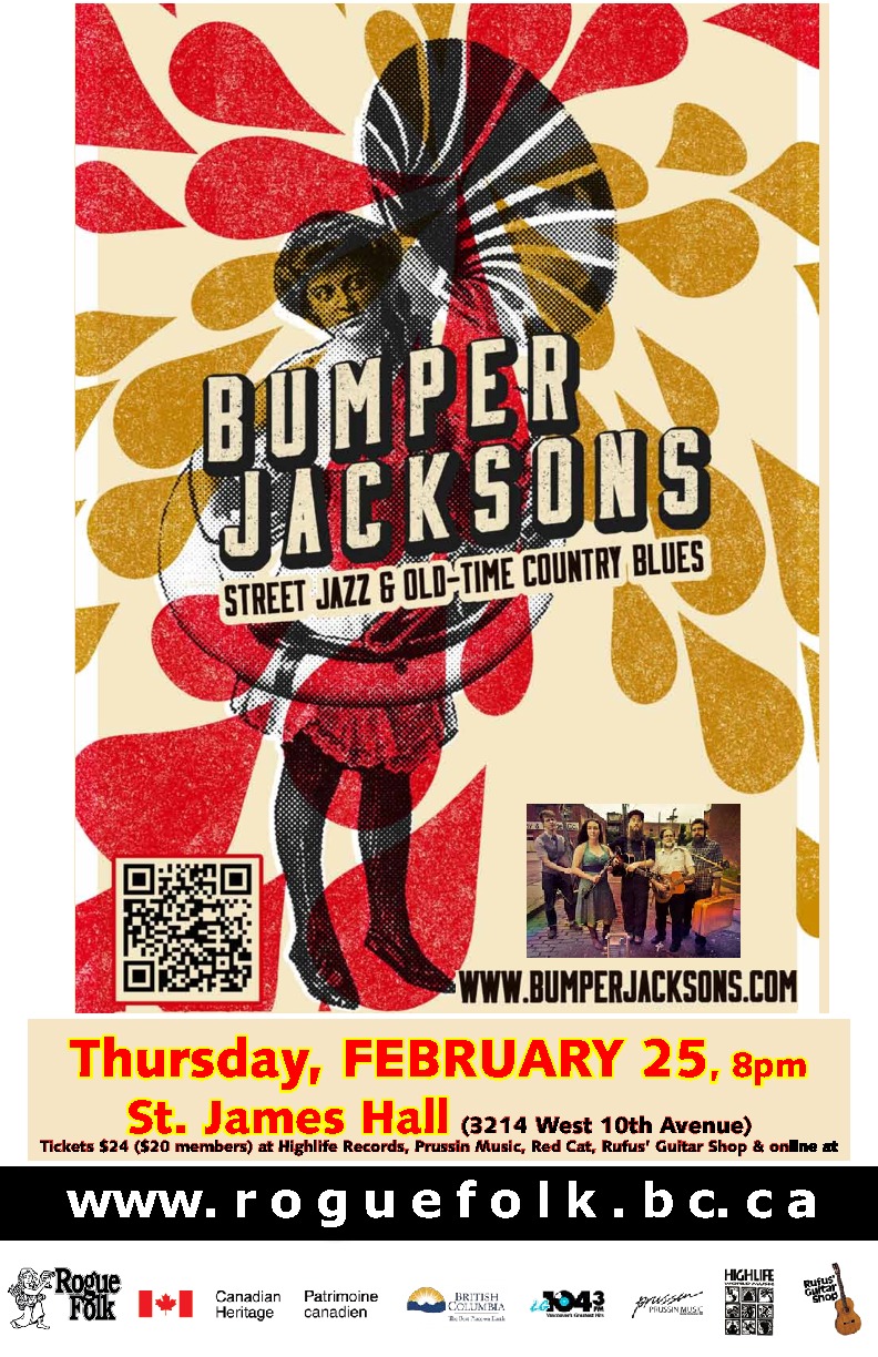 Like an old-time barn dance in downtown New Orleans, the Bumper Jacksons pull together a vast array of early American traditions into a deliciously cohesive sound that strikes you right in the heart. It’s a sound that’s pure passion…. joyous ragtime dances and roadhouse drinking songs are valleyed by delicate waltzes of loss and regret. They will be making their first trip across their Northern Border to perform at the Rogue Folk Club.