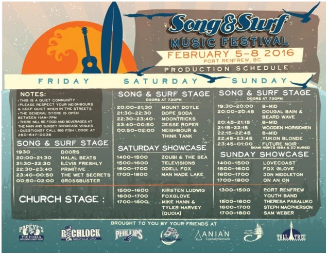 A winter music festival located on the true west coast of Vancouver Island in beautiful Port Renfrew, B.C. Whether you visit the spectacular Botanical Beach for storm watching and tidal pools, Avatar Grove or beachcomb along two miles of beach and surf between the San Juan and Gordon Rivers you will only be moments away from Song & Surf Music Festival - The island's most intimate winter gathering of artists, friends, and good times.