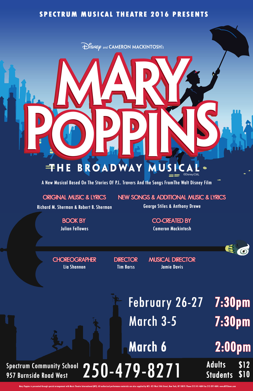 Spectrum Community School presents the Supercalifragilisticexpialidocious new musical Mary Poppins (The Broadway Musical). Based around the iconic Disney soundtrack, the Broadway version also reimagines & updates elements of the story and incorporates new settings & characters drawn from the original books by P.L. Travers. It opened on Broadway in 2006 and was nominated for 13 Tony Awards, winning 3 of those. Runs February 26-27 & March 3-5 @ 7:30 PM & March 6 @ 2:00 PM plus a special “Sing-A-Long” performance March 5 @ 2:00. Tickets $12/$10. Info @ 250.479.8271.