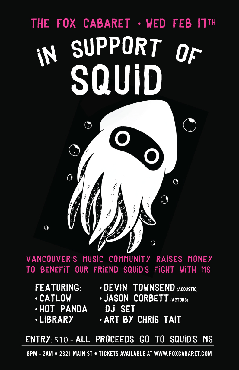 Vancouver's music community gets together to raise money for Catlow bassist Squid who has been suffering from MS and can no longer work. Great line up, silent auction and Jason Corbett Djing from Actors.