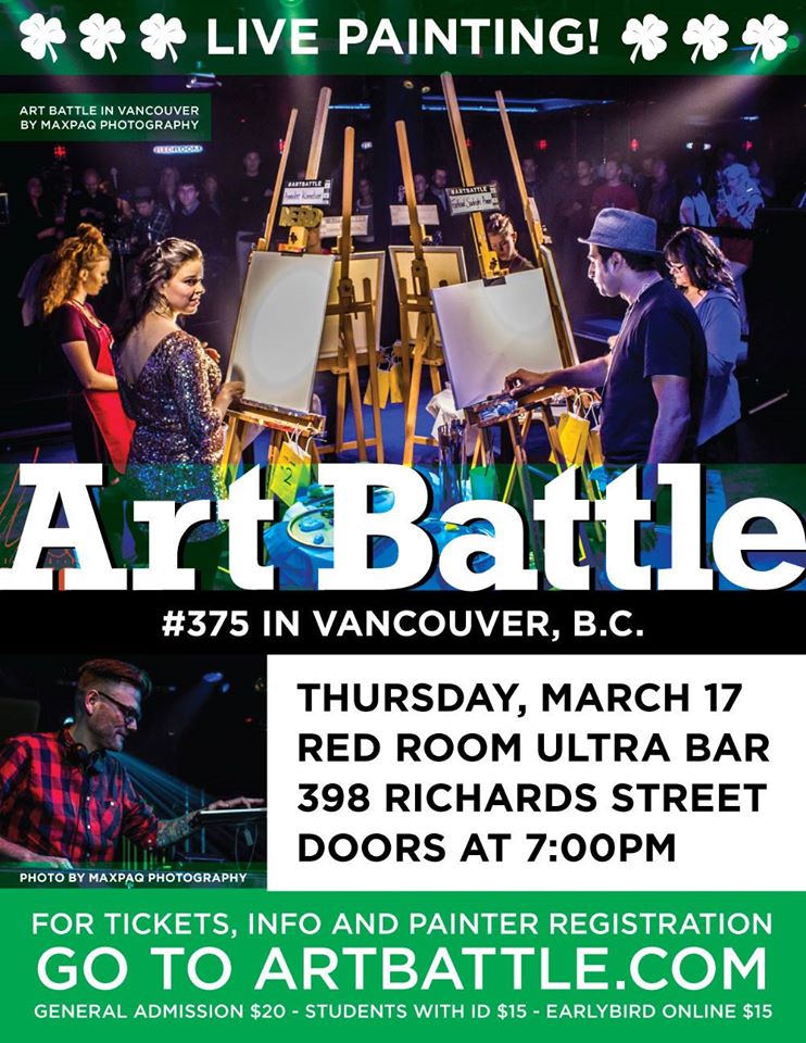 Join us downtown Vancouver at Red Room for an exciting night of live competitive painting with Art Battle on St. Patrick's day - Thursday, March 17th! Doors open at 7PM, all Vancouver AB events are 19+ http://artbattle.ca/ab/ab375-vancouver/