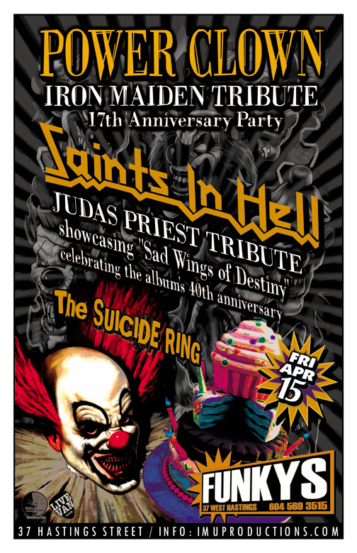 . Friday, April 15th IMU presents POWER CLOWN Iron Maiden Tribute 17th Anniversary Party w/ SAINTS IN HELL Judas Priest Tribute & The SUICIDE RING @ Funky Winkerbeans, 37 W Hastings Street. Show 9:30pm / $10 cover