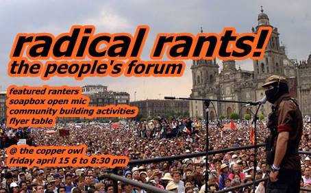 radical rants! (the people's forum): Robert Nye, Dante Chicano, Chrissy Brett, Chris Perrin, Marlene E. Simmons, Mackenzie Ocherton @ Copper Owl Apr 15 2016 - Dec 23rd @ Copper Owl