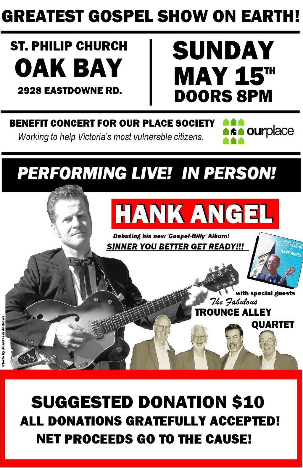 If the good Lord's willin', and the creek don't rise, there'll be a good ol' fashioned Gospel show! A benefit for The Our Place Society at St Philip Anglican Church. Featuring Hank Angel and his Island Devils. Debuting their new Gospel-billy Album; Sinner You Better Get Ready!!! With Special Guests, the fabulous Trounce Alley Quartet! Suggested Donation $10.Donations gratefully accepted. Net proceeds from the door and album sales go to Our Place!