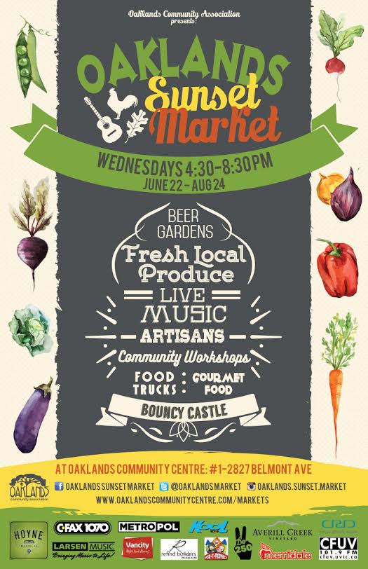 The Oaklands Market is a free weekly outdoor market that runs every Wednesday from June to September offering local fresh food, live music, a beer garden, community events and a chance to meet your neighbours. The Market is hosted at the Oaklands Community Centre at 1-2827 Belmont Ave in Victoria. Since its beginning in 2012, the market has grown in size and frequency and now includes up to 50 vendors representing fresh produce, prepared food, hot food, arts and crafts, local non-profits and small businesses. Oaklands Community Association hosts the Market in order to provide a venue for neighbours and local businesses to come together and build community connections.