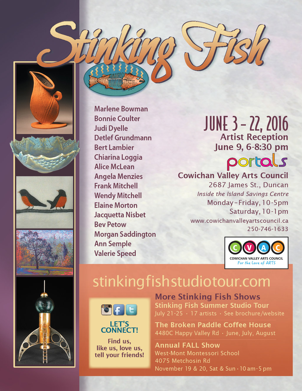 The Stinking Fish Studio Tour will be exhibiting at the CVAC Portals Gallery in Duncan for the month of June. Participating artists are Marlene Bowman, Bonnie Coulter, Judi Dyelle, Detlef Grundmann, Bert Lambier, Chiarina Loggia, Alice McLean, Angela Menzies, Frank Mitchell, Wendy Mitchell, Elaine Morton, Jaquetta Nisbet, Bev Petow, Morgan Saddington, Ann Semple and Valerie Speed.