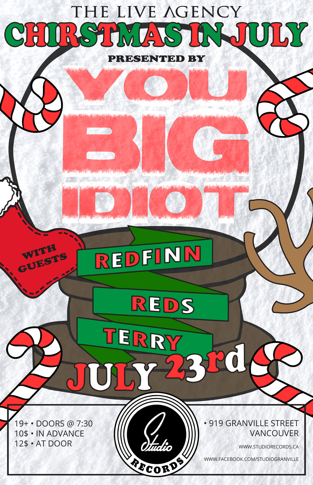 The Live Agency Presents Christmas In July featuring You Big Idiot with special guests Redfinn, REDS and Terry, July 23rd at Studio Records.