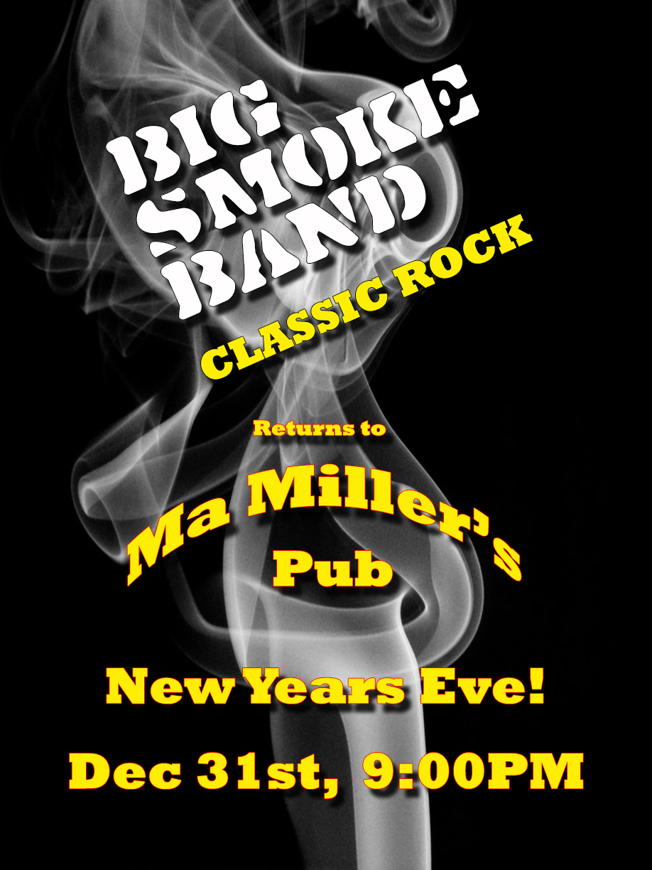 Big Smoke will be performing at Ma Millers Pub New Years Eve! It's sure to be a rockin event! Details will be announced as they are released! Great Venue, Great Staff, Great food, and Great Music!!!