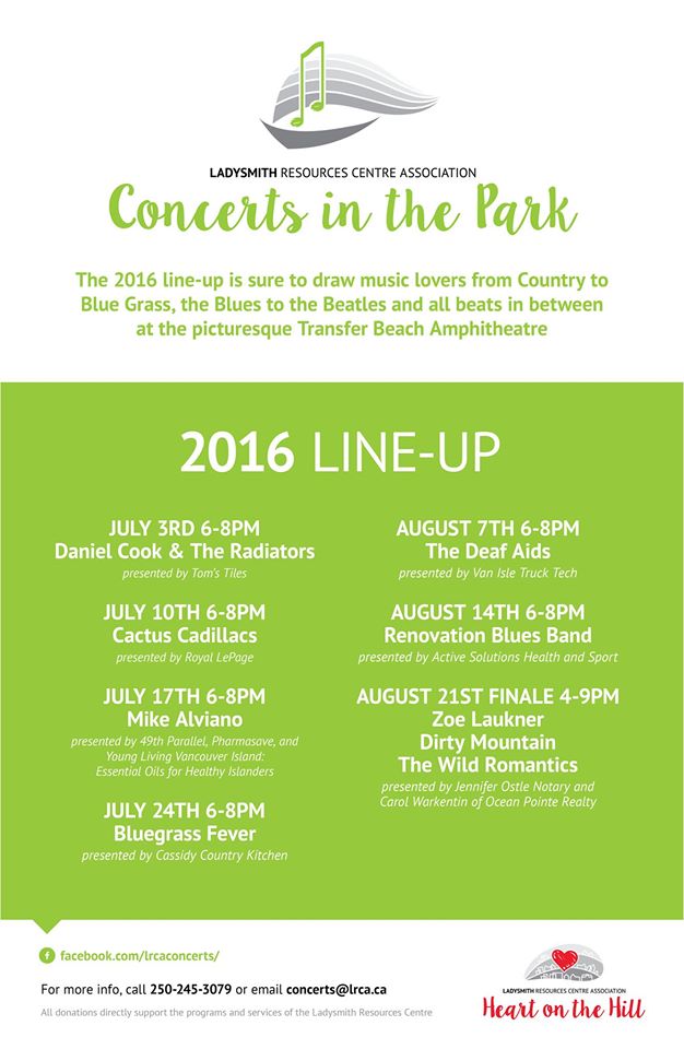 Concerts in the Park are a FREE summer community event, hosted at the stunning Ladysmith Amphitheatre. The series brings a variety of musical performers to provide a 2 hour concert, serving as a fundraiser for the Ladysmith Resources Centre Association. All donations go towards supporting their programs, geared towards enhancing the health and well-being of Ladysmith residents.