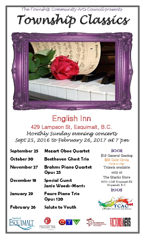 Township Classics starts at 7pm on Sept 25th, the first of our monthly House Concerts at the English Inn. Enjoy world class classical music the last Sunday of each month from September to February. Tickets can be purchased closer to the date of the first concert.