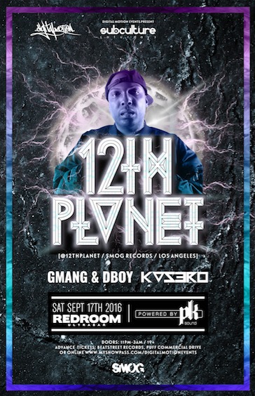 12th Planet is the electronic music pioneer whose off-axis beats and subsonic frequencies orbit on the forefront of global bass culture. Recently named “Los Angeles dubstep god” by Rolling Stone, 12th Planet AKA John Dadzie and his influential label SMOG Records are widely credited for bringing the British movement stateside, and continue to be a crucial force in the evolution of electronic music. 12th Planet's DJ sets now include a myriad of styles that reflect the current, diverse landscape of EDM music and continue to display his role as an essential tastemaker in the dance music world.