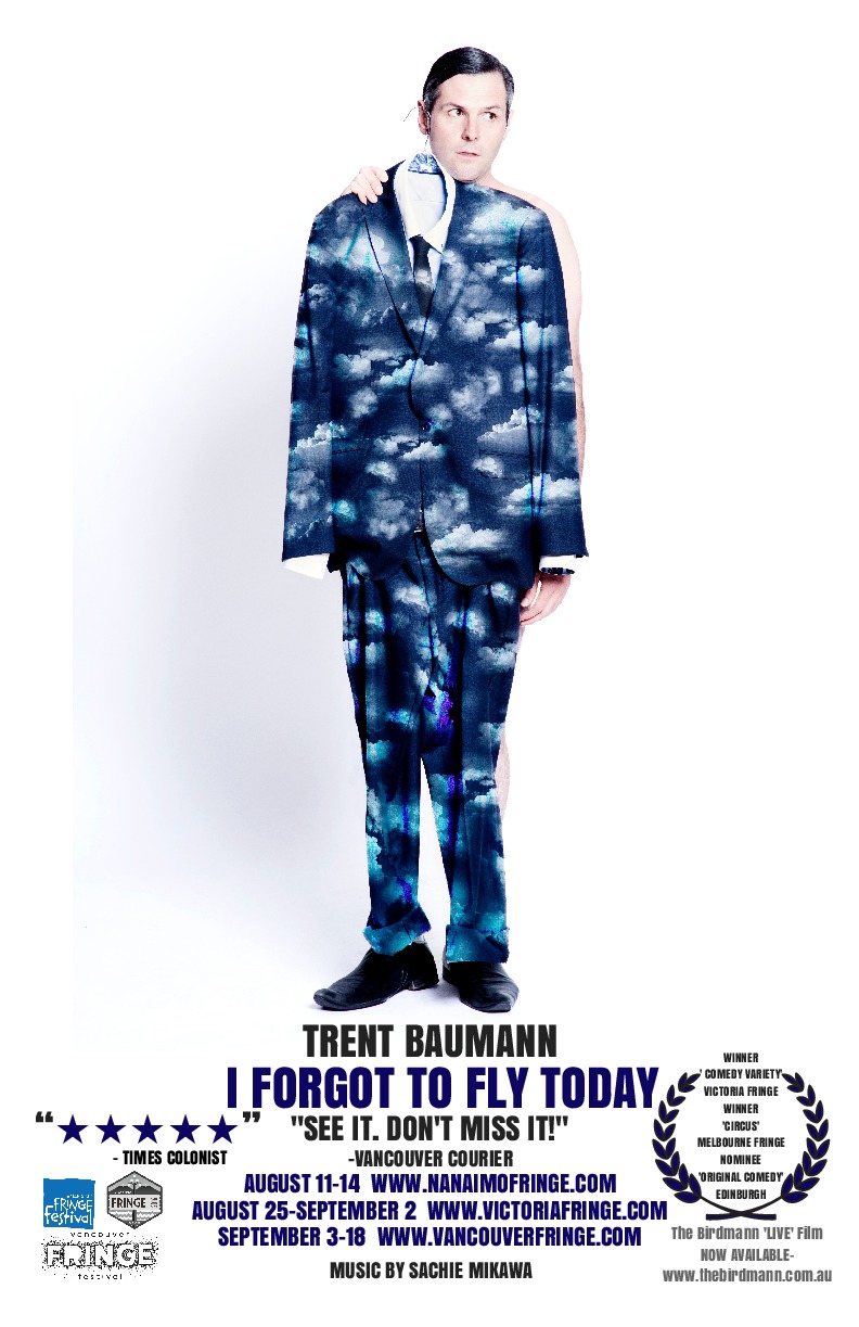 Trent Baumann, Australian luminary of the international fringe circuit, will debut his new show ‘I Forgot to Fly Today’ on the anniversary of his 10th world tour. Baumann, most infamously known as The Birdmann, is the winner of multiple Fringe Festival awards including ‘Best Comedy’ in Edinburgh, Montreal, Melbourne and three time winner in Victoria, BC. His latest show, ‘I Forgot to Fly Today,’ follows a day in the life of a man who decides to have the day of his life! It features Baumann’s trademark one-line jokes and variety imagery and is like a massive motivational monologue that is both uplifting and hilarious. Catch Baumann at this year's Victoria Fringe Festival, running Aug 25 - Sept 2, 2016.