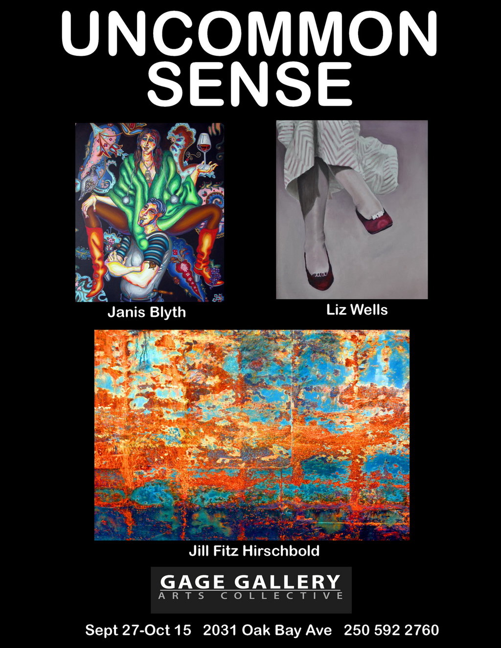 Three artists new to the Gage Gallery Collective come together in "Uncommon Sense”. Liz Wells bases her work on personal family events that deal with concepts of memory and issues of female representation. Suggesting a feeling or a glimpsed memory of an image leaves room for the viewer to make their own interpretation. Sharing female reflections and ideology is artist Janis Blyth. Her soulful paintings are rich in colour and statement with a whimsical approach. The art expresses the vitality and spirit of people interacting with one another and the temptations that surround them.