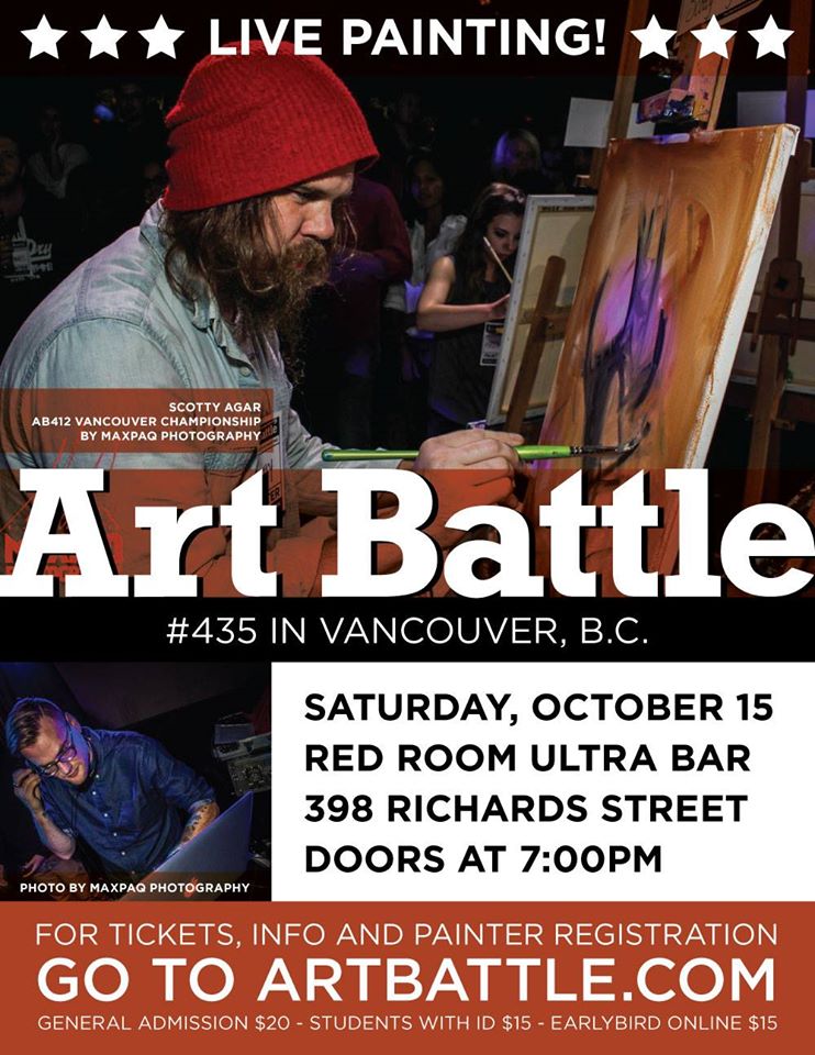 Art Battle is live competitive painting. Painters create the best work they can in 20 minutes. As they work, patrons move around the easels, closely watching the creative process. The medium is acrylic paint and the tools allowed are brushes, palette knives or any non-mechanical implements. At the end of the round, the audience votes democratically for their favourite painting and bids in silent auction to take the work home. Art Battle happens in cities across Canada and has hosted over 400 events over the past eight seasons of competitions coast to coast! AB takes place in Vancouver on the third Saturday of each month at Red Room Ultra Bar (Vancouver) :)