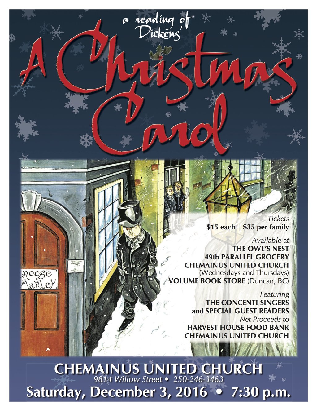 Join us for what is sure to be a beautiful evening and take time to prepare for what is at the heart of this festive season. This year, the Chemainus United Church will again host and present this classic Christmas story with guest performers, The Concenti Singers conducted by Sheila Johnson. The story will be brought to life by Chemainus Theatre Festival's Artistic Director Mark DuMez, local actors Erin Ormond, Bruce Ormond and John Wray, Minister of Chemainus United Church. The evening will be hosted by Jamie Stephen.