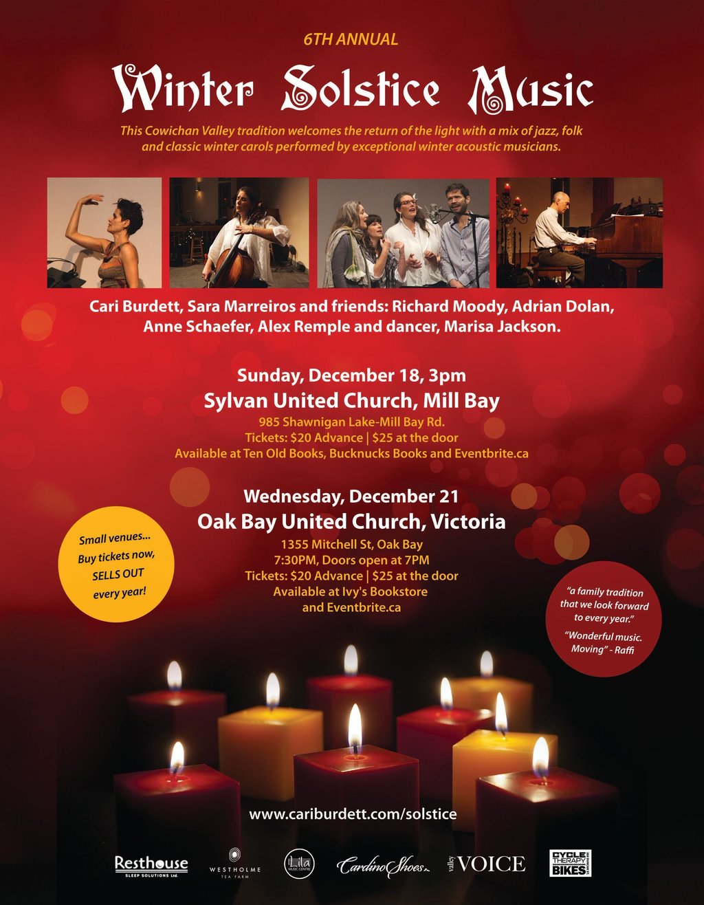 Cari Burdett, along with acclaimed Fado singer Sara Marreiros and uber-talented musician friends return this year to present the 6th Annual Winter Solstice Concert in Duncan. This beautiful Cowichan Valley tradition weaves acoustic music together with movement and voice, providing warmth and peace on the longest night of the year. This years event will be visiting Mill Bay and Victoria; the Victoria show takes place on the evening of the Winter Solstice itself.
