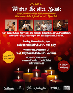 Cari Burdett, Sara Marreiros and friends are returning this year to present the 6th Annual Winter Solstice Concert. This beautiful Cowichan Valley tradition is a family-fun event that weaves together eclectic music with movement and voice, providing warmth and peace on the longest night of the year. This years event will be visiting Mill Bay and Victoria.