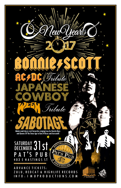 . Saturday, December 31st IMU presents NYE PARTY! BONNIE SCOTT AC/DC Tribute, JAPANESE COWBOY Ween Tribute + SABOTAGE @ Pat's Pub, 403 East Hastings Street. Doors 8pm / Show 9pm / $12 Advance Tickets @ Zulu, Red Cat & HighLife Records / $15 cover @ the door.