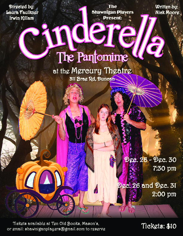 “Cinderella - the Pantomime” runs December 26 – December 31 at the Mercury Theatre, 331 Brae Rd. in Duncan. Show times are 7:30pm Dec. 26 – 30 and 2:00pm Dec. 26 and Dec. 31. All seats are $10. Tickets are available at Ten Old Books, Mason’s store in Shawnigan Lake, or you can reserve tickets online by emailing [email protected].