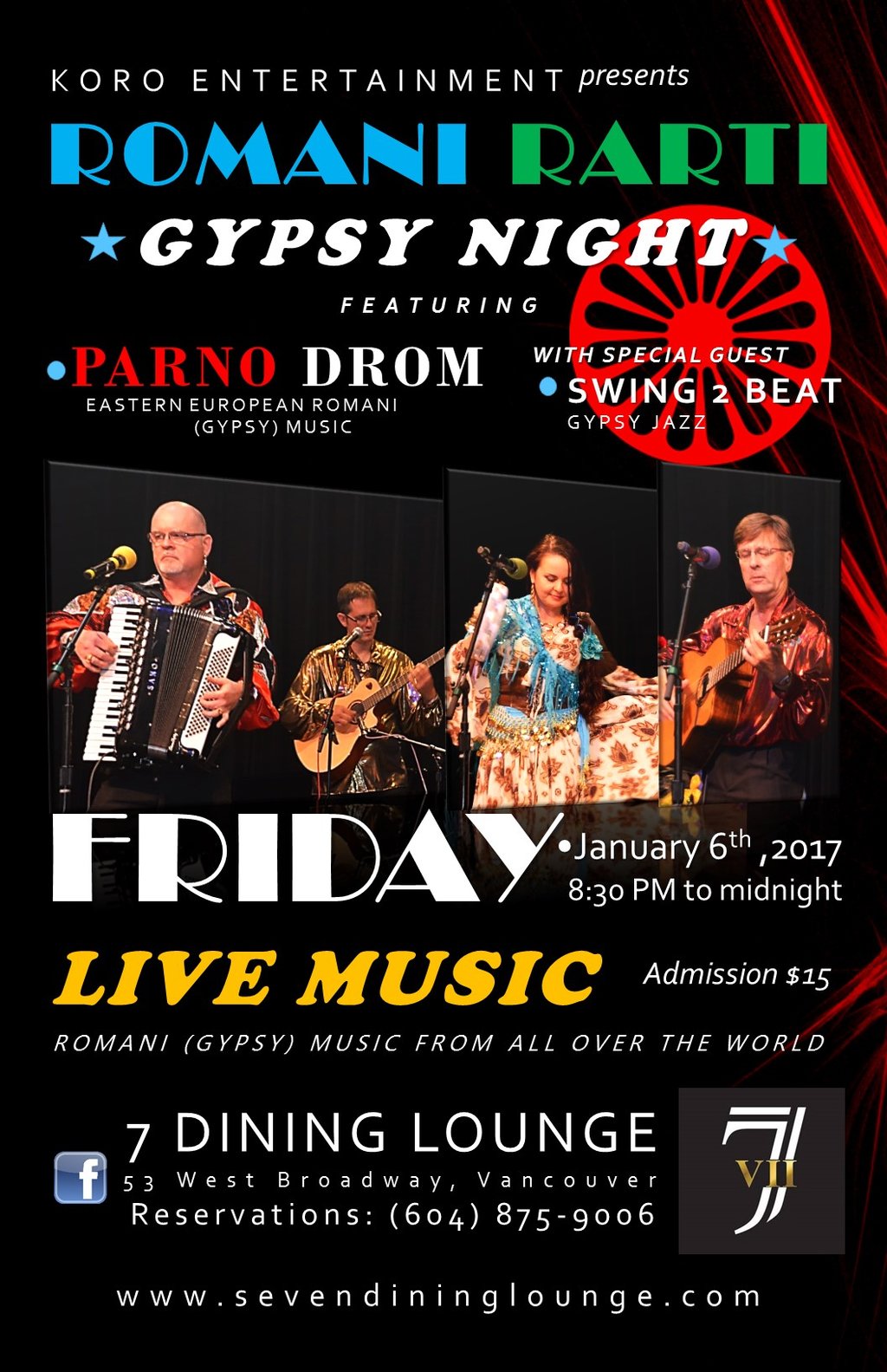 Every first Friday of each month starting January 6th, 2017 we welcome you to our Romani Rarti ( Gypsy Night ) at the 7 Dining Lounge , 53 West Broadway in Vancouver. We will have a main music group PARNO DROM performing Eastern European Romani (Gypsy) music and we will have a guest performers or groups performing Romani (Gypsy) music from all over the world. Each month different guest performers.
