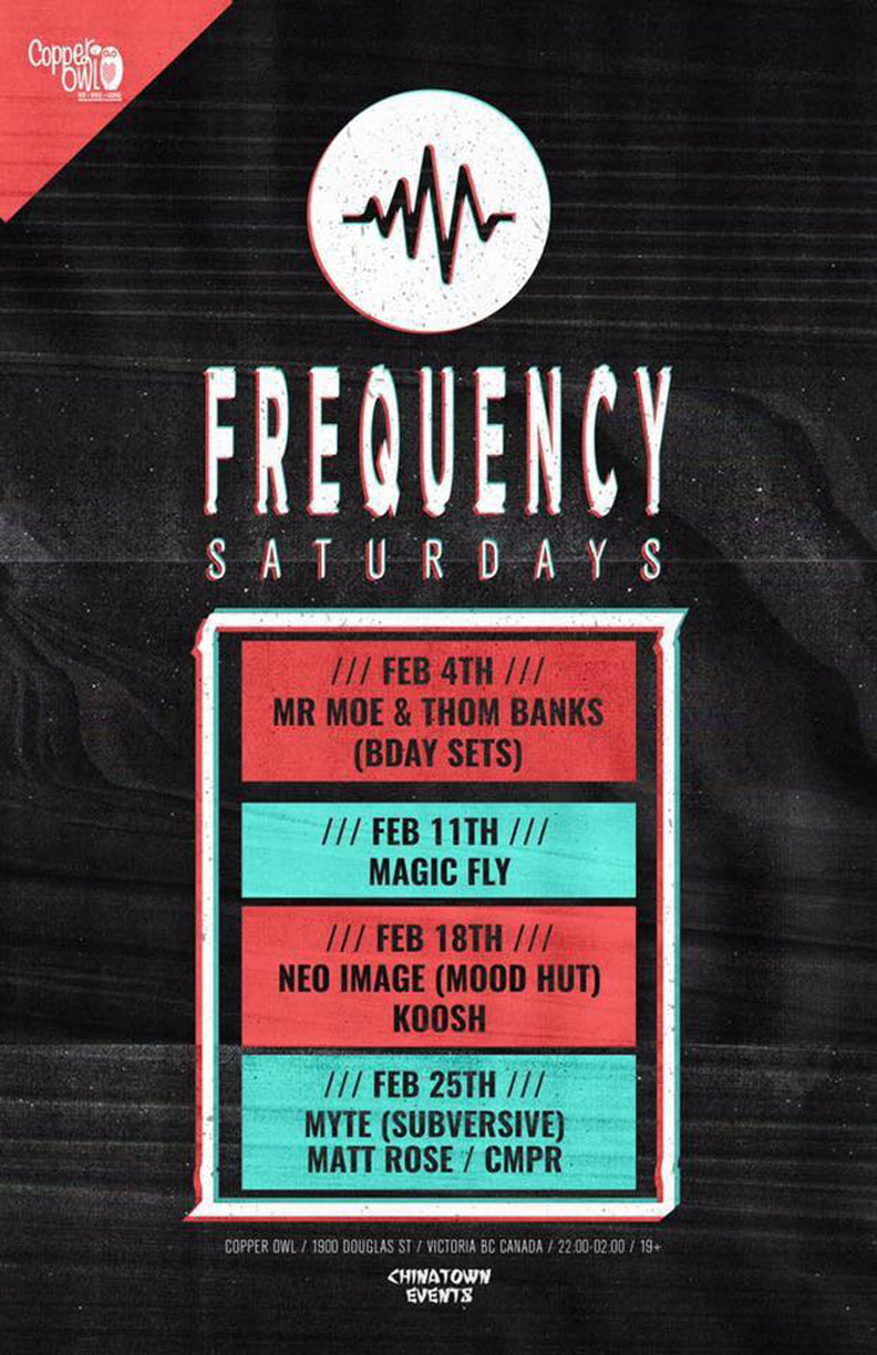 Frequency Saturdays at the Copper Owl is a weekly dance event bringing free thinking artists and DJs together with open minds and open ears in intimate setting. We don't like constricting music to genres, trends or biases. We believe dancing should be unrestrained, ecstatic and communal.
