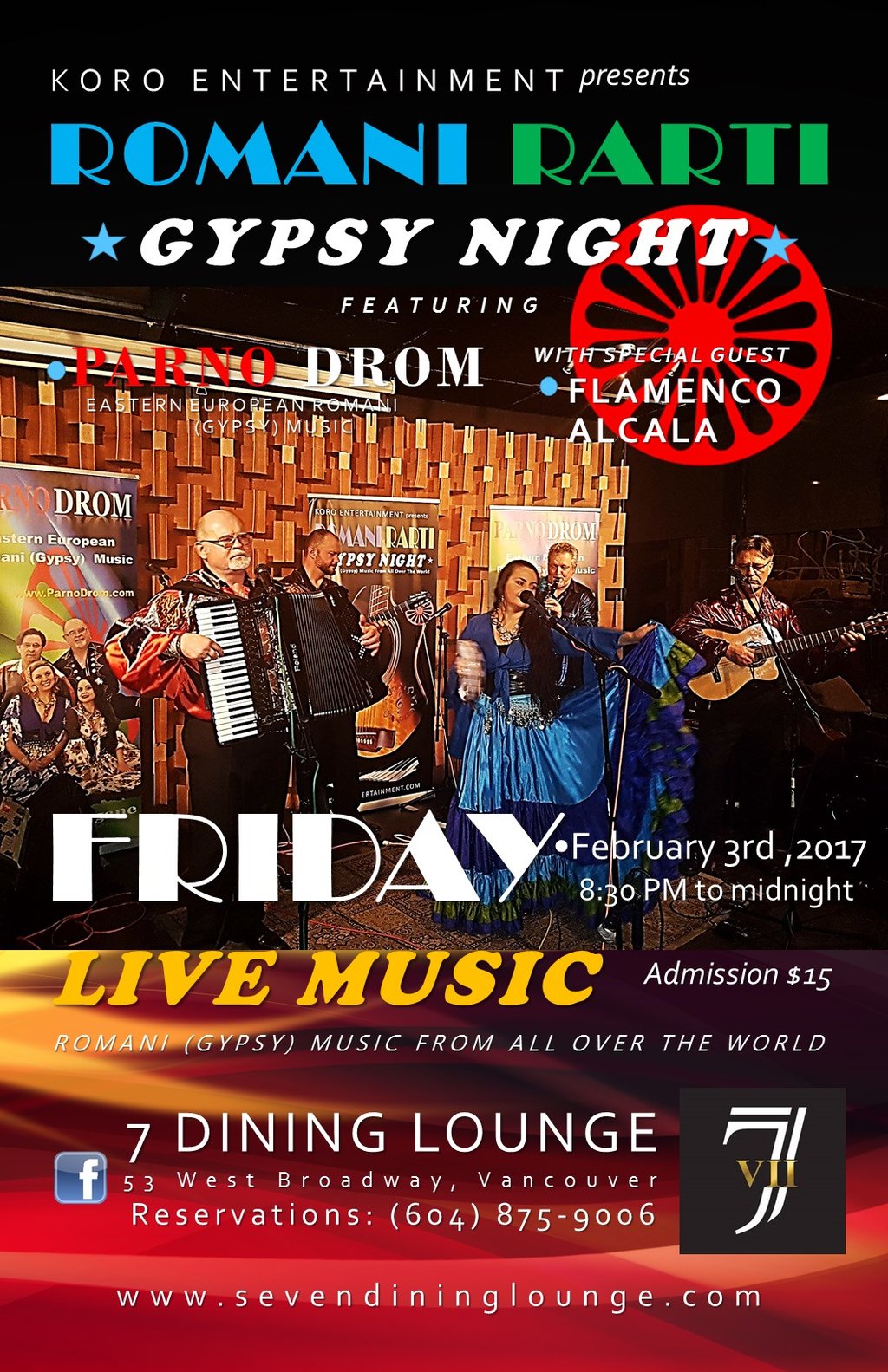 Romani Rarti ( Gypsy Night ) at the 7 Dining Lounge , 53 West Broadway in Vancouver. Romani (Gypsy) music from all over the world.