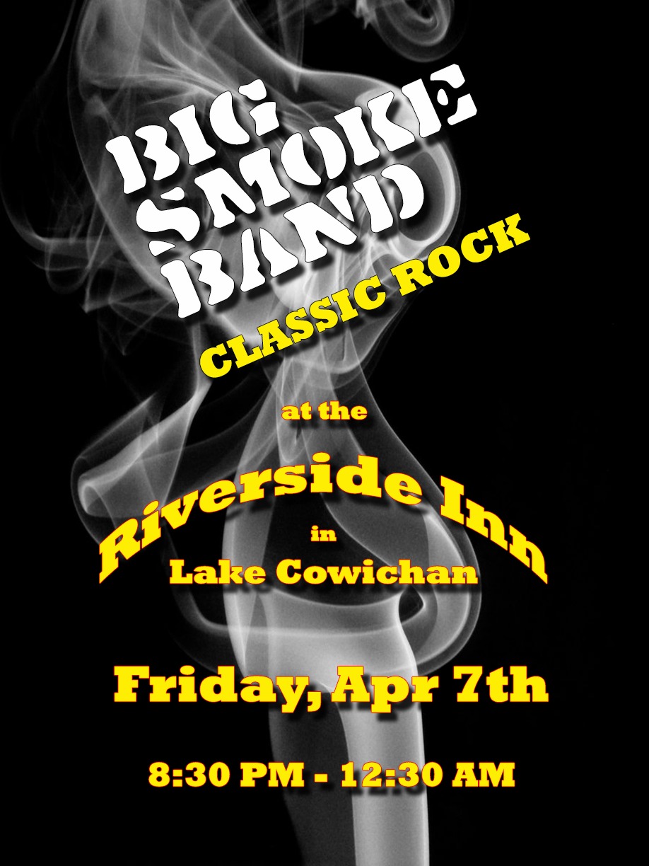 Very pleased to announce Big Smoke will be returning to The Riverside Inn Lake Cowichan on Friday Apr 7th. We had a blast last visit and are really looking forward to another go! Please come on out and Join Us! It’s a terrific Venue with Delicious food, Great staff, and a view that’s to die for! Cya there!