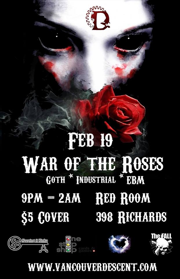 War of the Roses really celebrates the idea of the different sides of love. No matter where you fall down on romance you can express your real thoughts on it here. Vancouver Descent is a friendly place to enjoy some dark culture. Join us February 19th. Don’t stay home, don’t make excuses, Make the Descent!