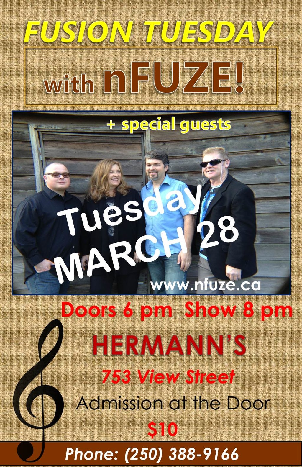 nFuze will perform exciting original fusion pieces as well as interpret covers by greats such Pat Metheny, Billy Cobham, Jean-Luc Ponty, and more. nFuze consists of Dean Wolfe on guitar, Andy Okell on drums, Sheldon Bordal on bass and Dee Cooper on Keyboards. Plus Special Guests!