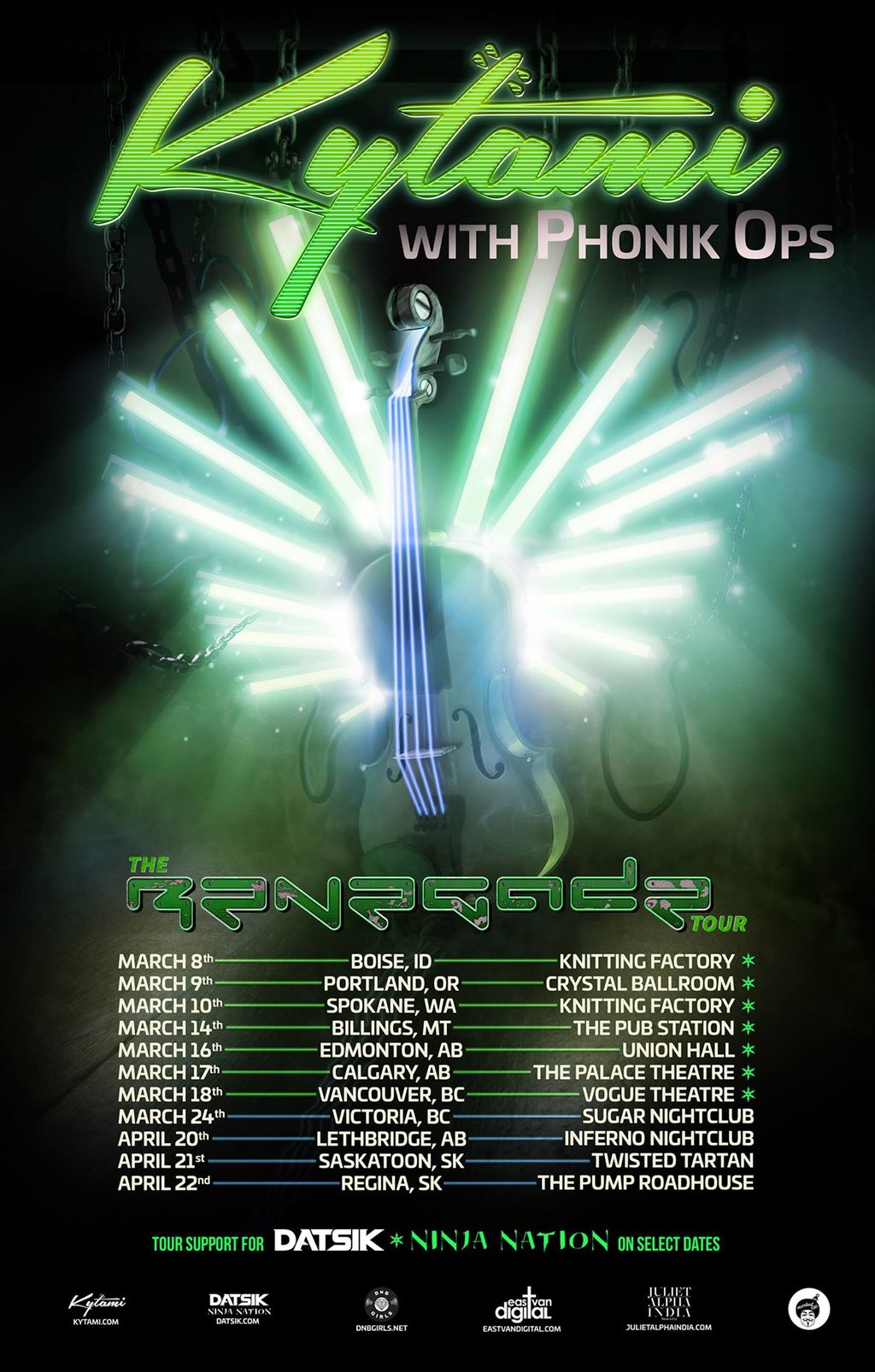 Through an alchemy of classical, fiddle styles fused with the heavy bass elements of Drum n Bass, Dubstep and Hip Hop, Kytami has managed to soar above the constraints of musical genre and labeling and today she is regularly dubbed Canada's most diverse and engaging fiddle player.