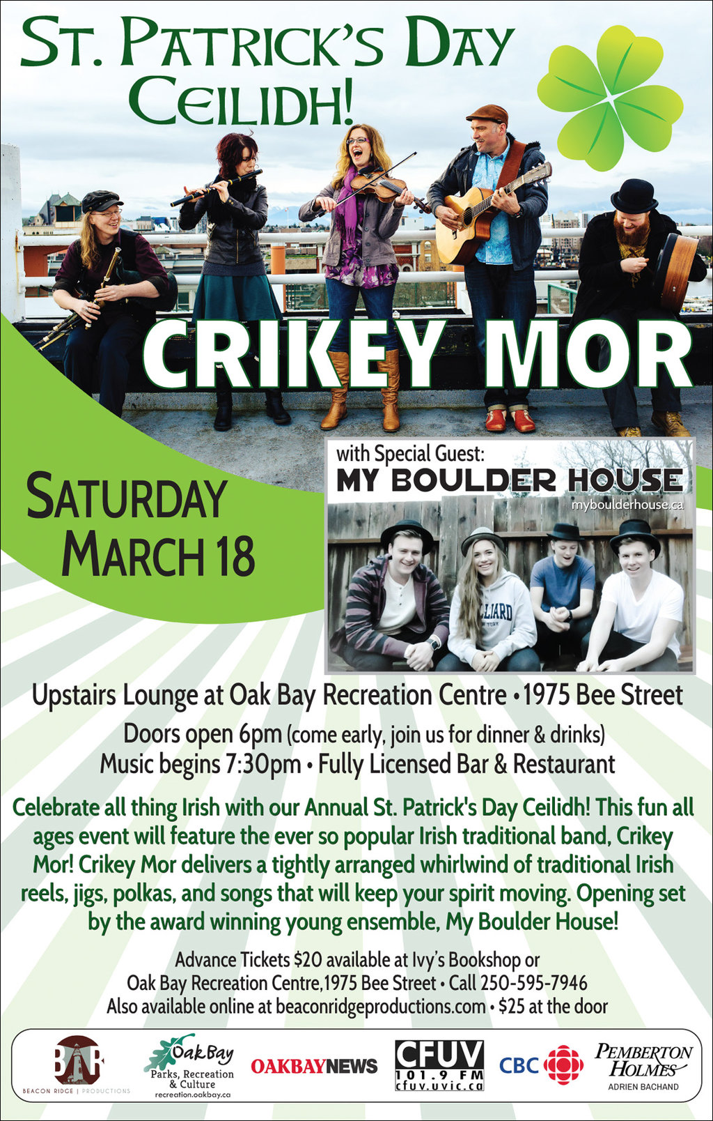 So come share an evening of traditional Irish reels, jigs, polkas, and songs that will keep your spirit moving and your feet tapping. Plus enjoy traditional Irish food and drinks in the licensed all ages Upstairs Lounge at the Oak Bay Recreation Centre, 1975 Bee Street, remember, doors open at 6 pm for dinner service, the 'craic' starts at 7:30 pm!