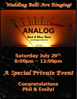 We are honored to have been chosen to provide our special blend of live vintage rock & blues music to this couple's happy day! We will be making this a party to remember! **Private Function**