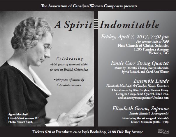 On Friday, April 7, 2017, the Association of Canadian Women Composers will celebrate 100 years of women's right to vote in British Columbia, with "A Spirit Indomitable" a concert featuring the women's choir Ensemble Laude, the Emily Carr String Quartet, and introducing soprano Elizabeth Gerow, and pianist Jannie Berdeti.