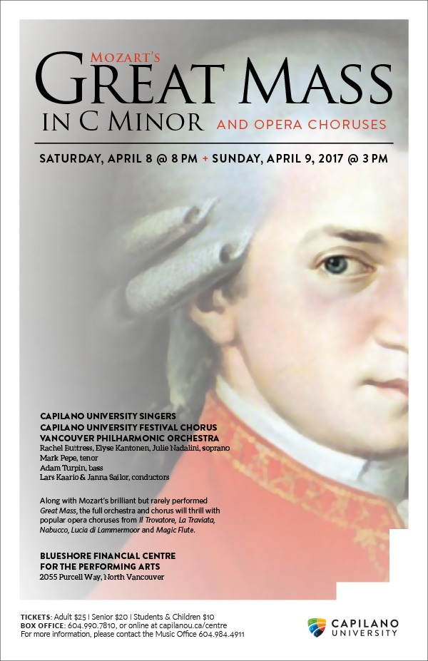 Mozart's brilliant Great Mass performed by Capilano University's 120-voice choir and the Vancouver Philharmonic Orchestra. Plus the thrill of popular opera choruses from Il Trovatore, La Traviata, Nabucco, Lucia di Lammermoor and Die Zauberflöte, and Preludio Sinfonico by Puccini.
