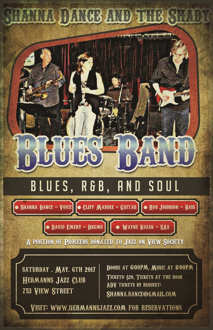 Featuring Shanna Dance with Wayne Kozak - sax , Rob Johnson - bass, Cliff Maddix - guitar, Dave Emery - drums. The Shady Blues Band repertoire is comprised of of R&B, Soul and Blues from Aretha Franklin, the Meters to the artistry of contemporary blues musicians such as Albert Collins, Freddy King and Ruthie Foster. We have built this selections of songs to keep in mind that a dancing audience is a happy one.