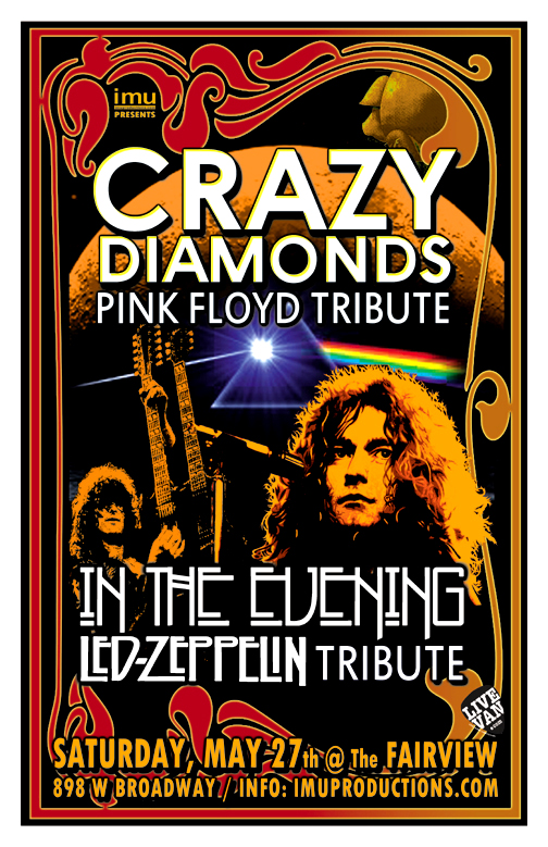 . Saturday, May 27th IMU presents CRAZY DIAMONDS Pink Floyd Tribute & IN THE EVENING Led Zeppelin Tribute @ The Fairview, 898 West Broadway . Show 9:30pm / $10 cover