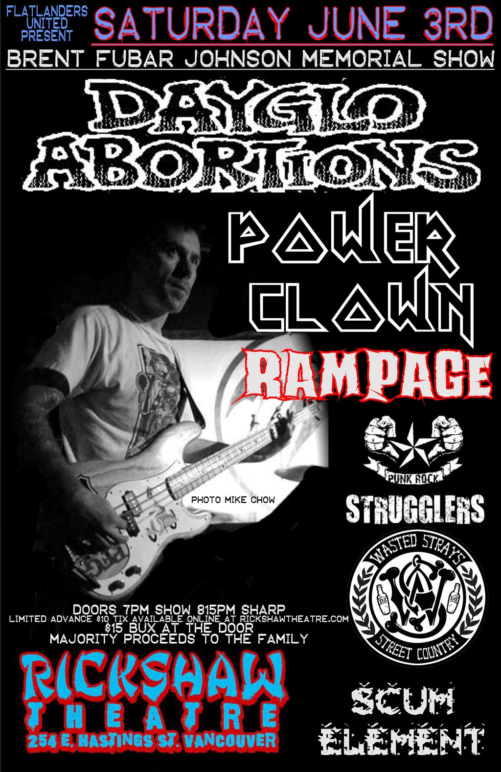 SAT JUNE 3RD * BRENT 'FUBAR' JOHNSON MEMORIAL SHOW FEATURING* DAYGLO ABORTIONS * POWERCLOWN * RAMPAGE * THE STRUGGLERS * WASTED STRAYS * SCUM ELEMENT * DOORS 7PM SHOW 815PM SHARP * TIX $15 AT THE DOOR * MAJORITY PROCEEDS TO THE FAMILY *