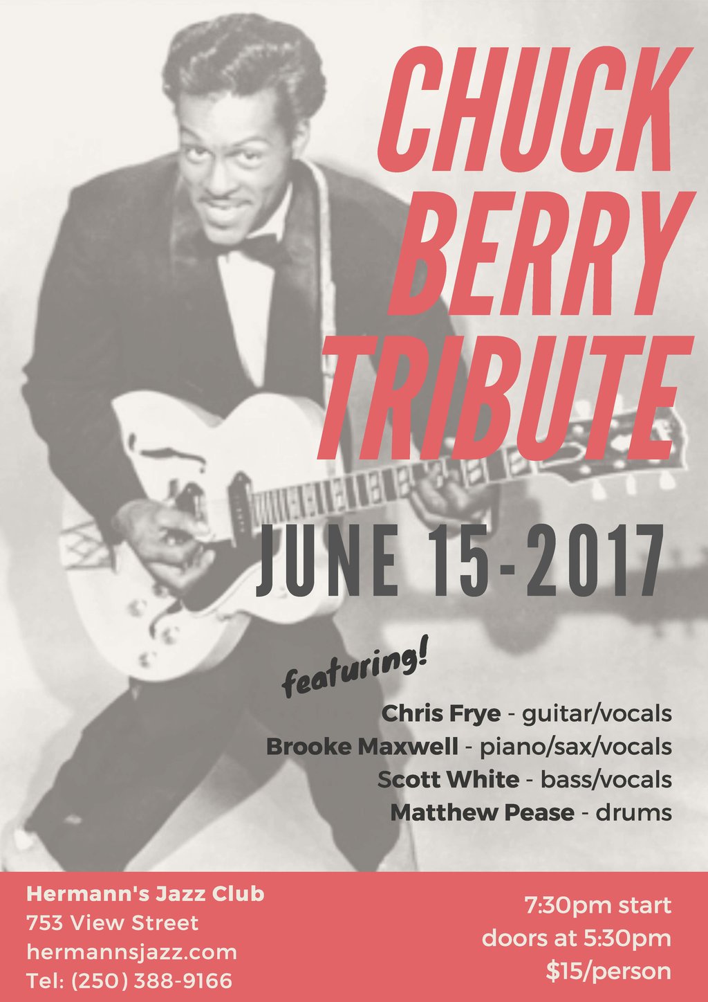 A crack quartet of Chuck disciples will blow the roof off he joint: Chris Frye, guitar/vocals, Brooke Maxwell, piano/sax/vocals, Scott White, bass/vocals, Matt Pease, drums/vocals. Well if you feel it and like it, go get your lover then reel and rock it!