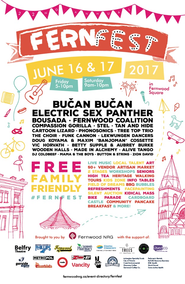 FernFest 2017: Bučan Bučan, Electric Sex Panther, Compassion Gorilla, The Fernwood Coalition, Stel, BOUSADA, Tan and Hide, Cartoon Lizard, Phonosonics, Tree Top Trio, Vic Horvath, Funk Cannon, Wooden Halls, Betty Supple & Aubrey Burke, Made In Alchemy, Button & String, Zion David, Doug the Hug, Maxim Cossette, DJ Coldbeef, Mam & the Boys @ Fernwood (NRG) Community Centre Jun 16 2017 - Feb 5th @ Fernwood (NRG) Community Centre