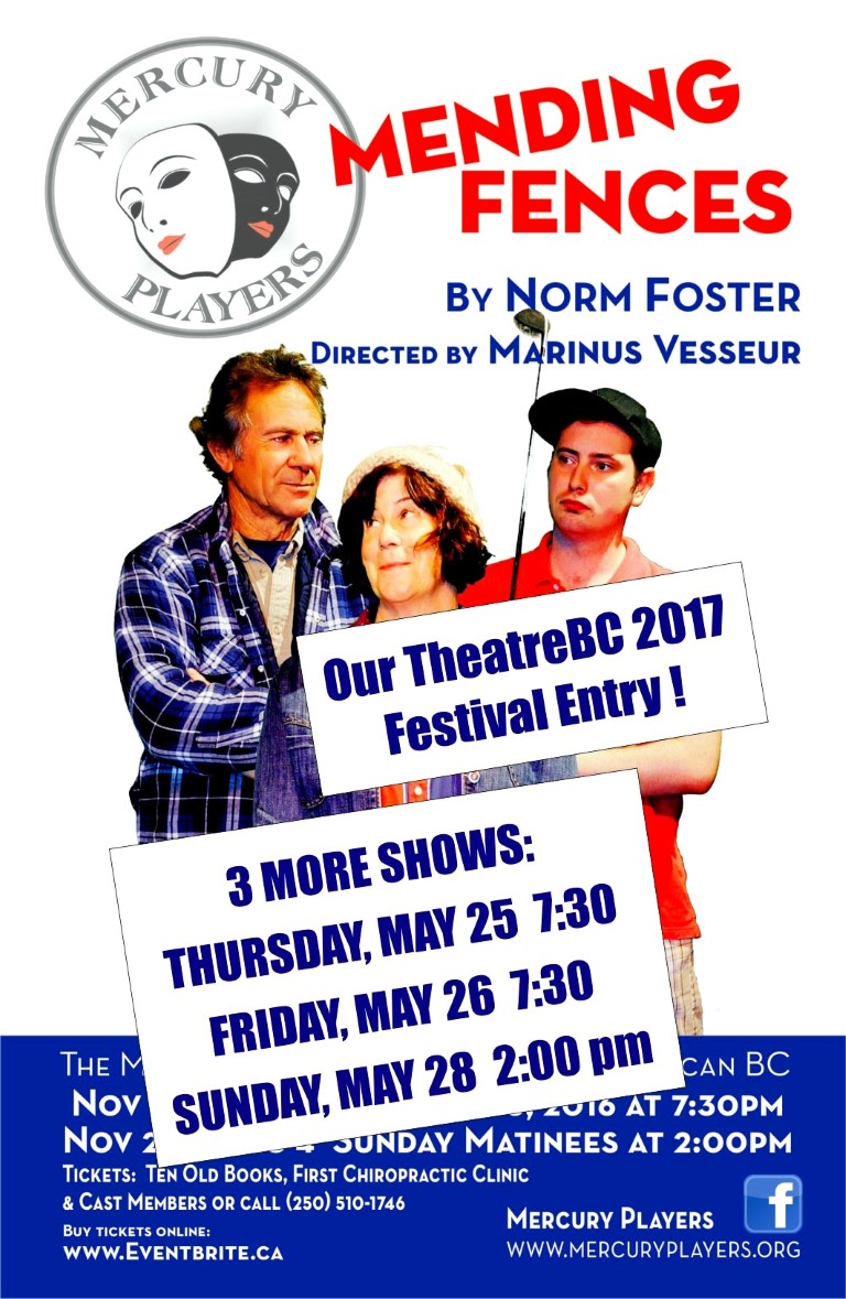 3 more chances to watch the [Improved] Mending Fences show by the Mercury Players! It was a hilarious and dramatic success, last November, so we decided to put it on again and enter it into the TheatreBC 2017 festival. If we win this 'locally', we'll take the production to the provincial festival in Vernon in July.