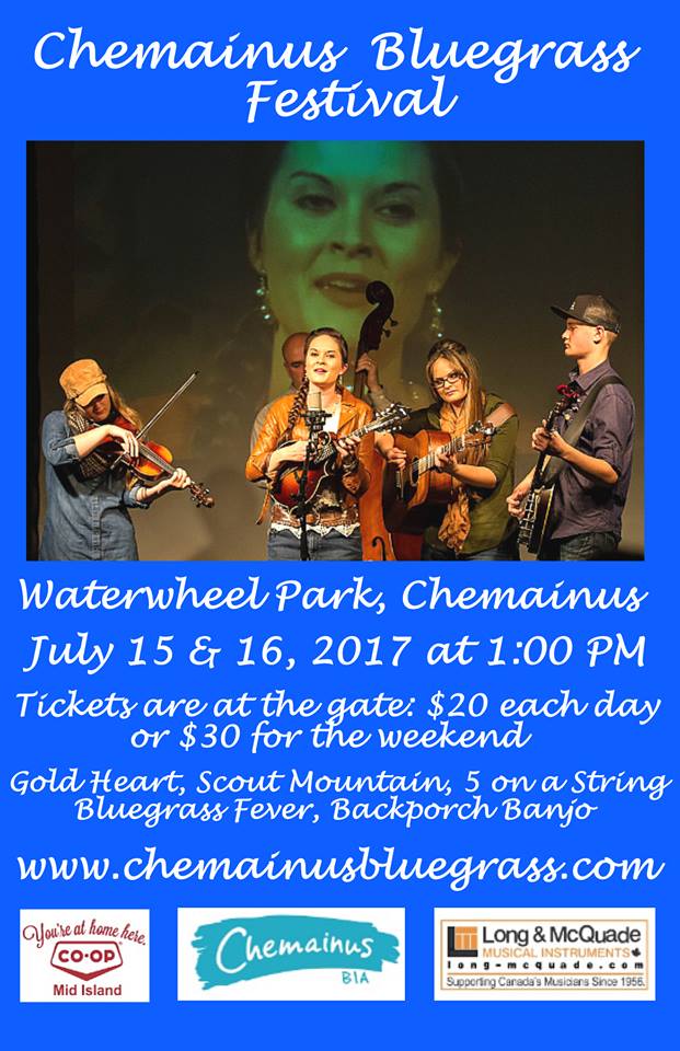 Chemainus Bluegrass Extravaganza: Bluegrass Fever, Scout Mountain, Gold Heart, Five on a String @ Chemainus Waterwheel Park Bandshell Jul 15 2017 - Feb 5th @ Chemainus Waterwheel Park Bandshell