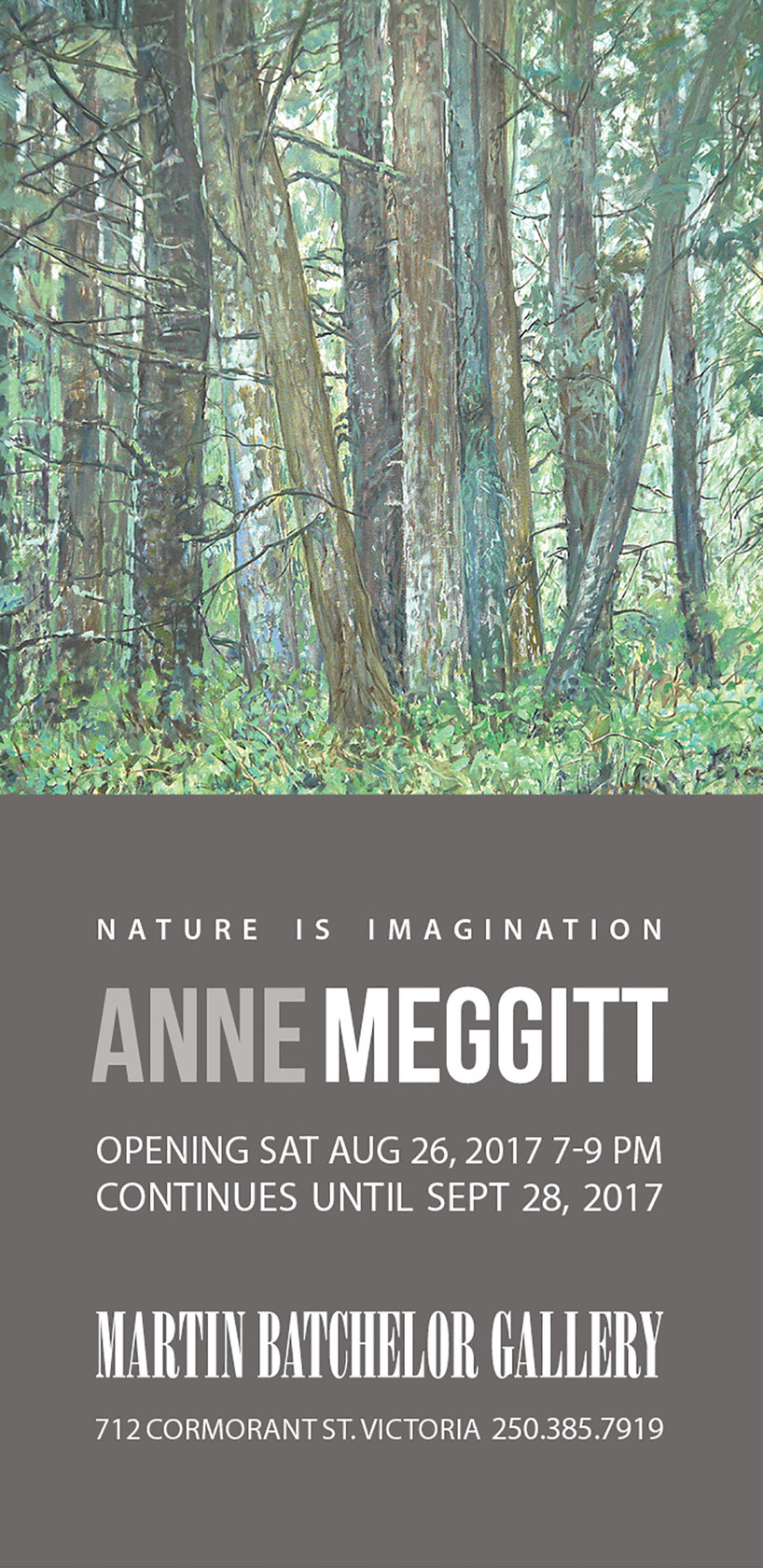 World traveller, explorer and Canadian landscape artist, Anne Meggitt, showcases her newest large oil canvases inspired by the magnificent coastal rainforest of Vancouver Island, opening August 26, 2017 at the Martin Batchelor Gallery in Victoria. Her solo exhibition 'Nature is Imagination’ reveals her work of the last four years since becoming a Victoria resident.