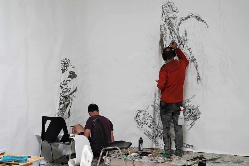 One month ago, Jim Holyoak and Matt Shane began their hike along the West Coast Trail, stopping along the way to make sketches and learn about the local ecologies in the park. Many slug drawings later the two returned to Open Space to begin a large-scale and immersive drawing installation called "Forestrial Brain".