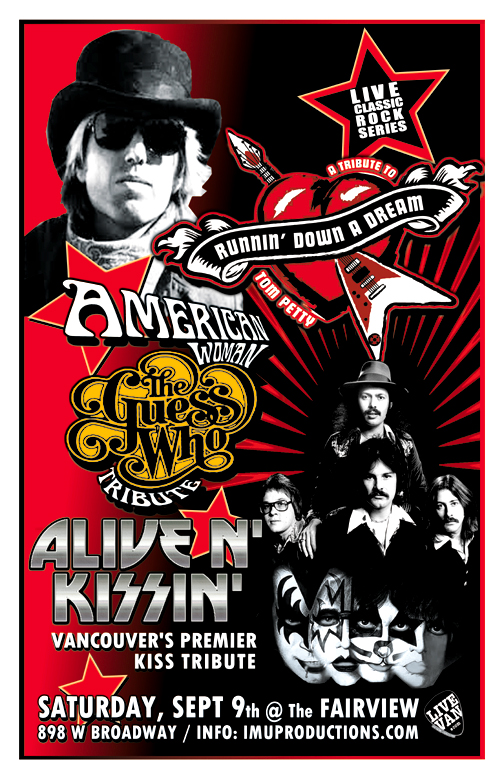 . Saturday, September 9th IMU presents RUNNIN' DOWN A DREAM Tom Petty Tribute, AMERICAN WOMAN A Tribute to the Guess Who & ALIVE N KISSIN' Vancouver's Premier Kiss Tribute @ The Fairview, 898 West Broadway . Show 9:30pm / $10 cover