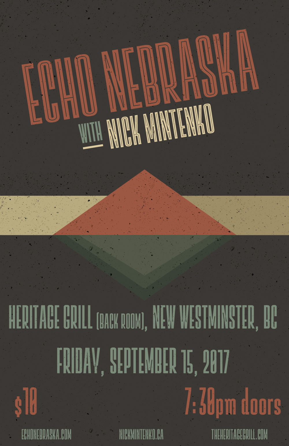 Join Vancouver folk-rockers, Echo Nebraska at The Heritage Grill (back room) in New Westminster, BC on Friday, September 15th. Supporting the band is Victoria's Nick Mintenko.