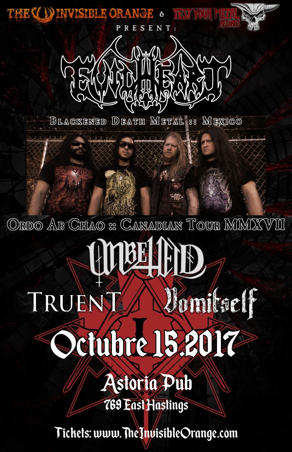 The most underrated death metal band to rise from the sands of Mexico Evil Heart travel to Canada to unleash their assaulting fiesta at The Astoria on October 15. Unbeheld and Truent spice up the night with their deadly west coast flair at the not so family oriented affair. Appropriate attire: Band t-shirt, black jeans and sombreros paired with corpse paint are definitely welcome.