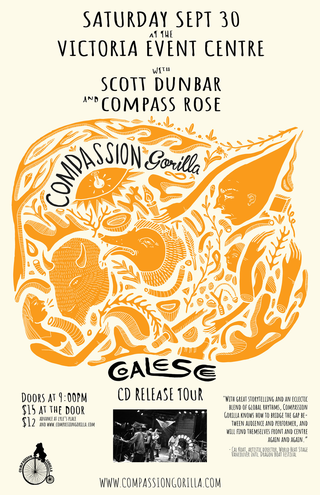 With their third studio album, Coalesce, Compassion Gorilla offers up a unique interpretation of diverse and worldly musical styles, weaving together earthy and folkloric sounds with sophisticated and punchy modern sensibility. The album is officially released September 14th, and is accompanied by a busy fall tour in the band’s home province of BC.