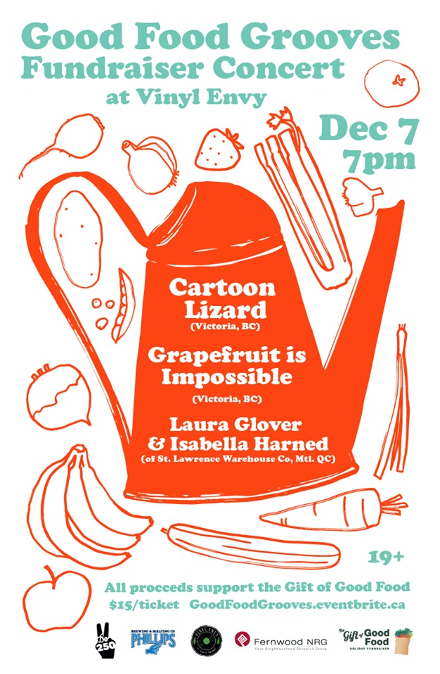 Fernwood NRG and Vinyl Envy are proud to present Good Food Grooves: a fundraiser concert with live music from Cartoon Lizard, Grapefruit is Impossible, Isabella Harned & Laura Glover.
