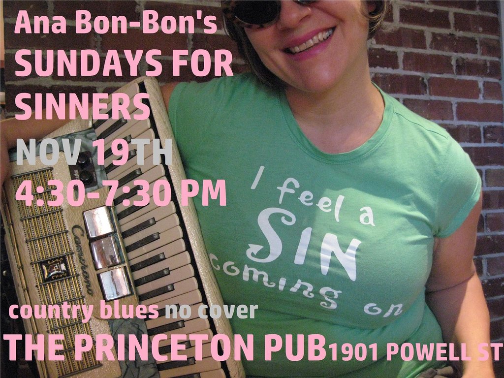 Ana Bon-Bon's showcase returns monthly to the historic Princeton Pub & Grill -1901 Powell St at Victoria Drive- in East Van's brewing district! Swingin' Country Blues trio featuring Mike Kenney (Modelos, Canucks game organist) on guitar, Taylor Little (The Judys, Bughouse 5) on drums, and Ana Bon-Bon leading the revelry on rhythm accordion and vocals...With frequent special guests, rotating craft brews, pool table, views of the trains, warm atmosphere, and friendly people. No minors. Free Entry! 4:30 pm-7:30 pm Nov 19th.