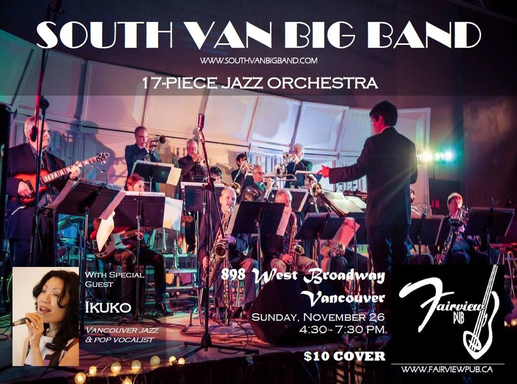 The 17-piece South Van Big Band and Vancouver jazz/pop vocalist Ikuko make their return to the Fairview Pub in November to bring some live big band jazz to a cozy Sunday afternoon! Come on down and enjoy some good grub and drinks against the sound of a wailin' big band!
